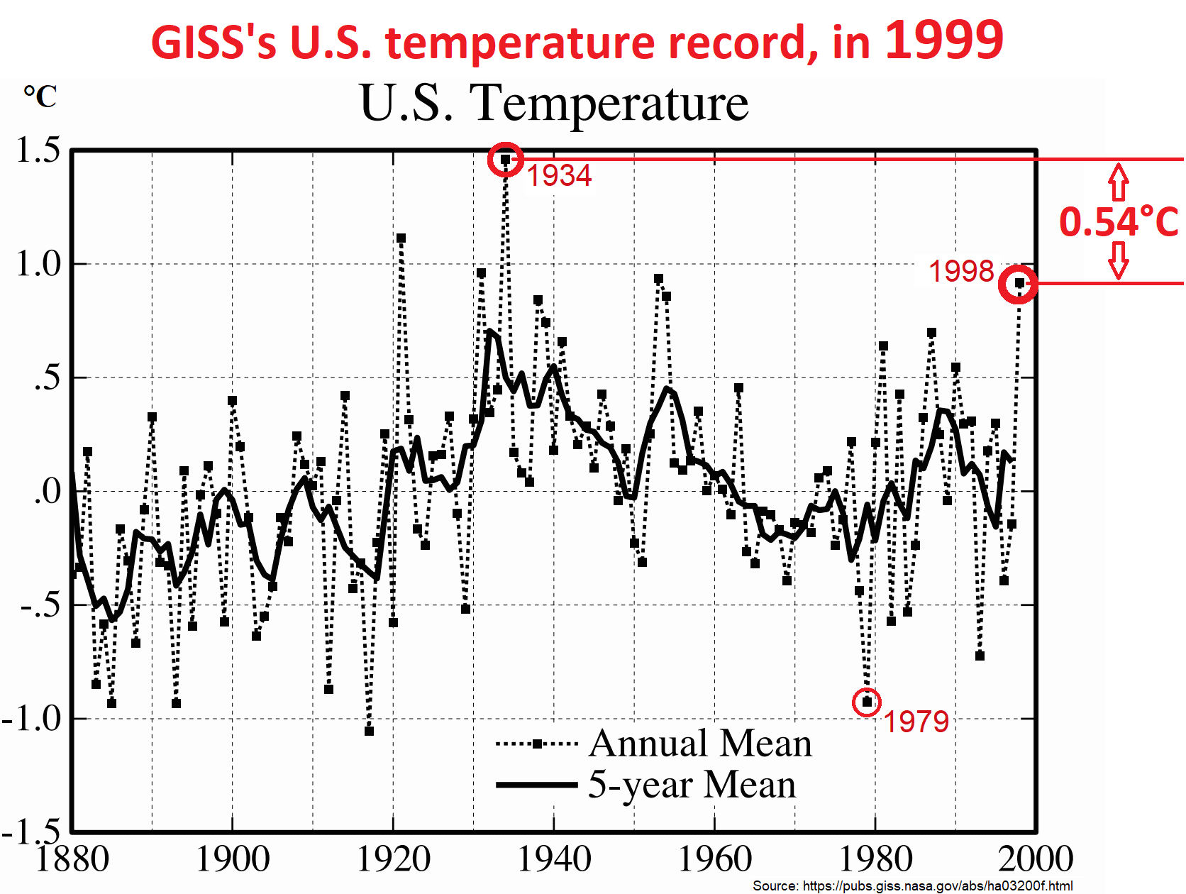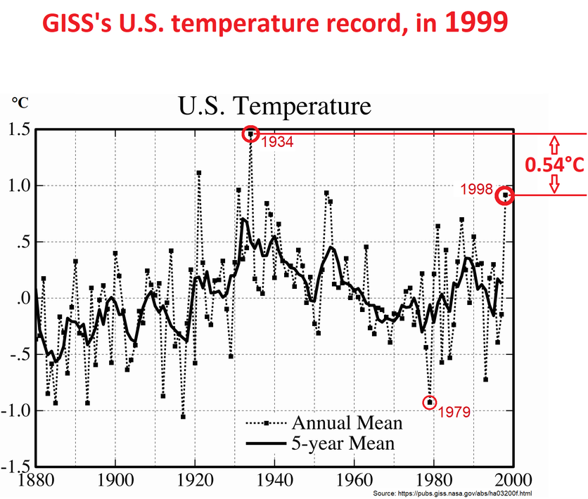 In 1999, they showed 1934 as 0.54 °C warmer than 1998. But now they show 1934 as 0.12 °C cooler than 1998. They cooled 1934 and warmed 1998 by a combined total of 0.66 °C, conveniently “straightening the hockey stick handle,” considerably.